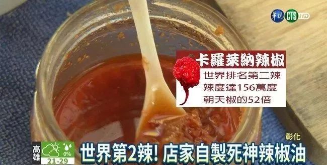 老板說印尼的朋友幫忙做好辣粉和辣油,他測試出加入飲料喝了發(fā)熱,不過朝天椒辣度3萬度,死神辣椒更高達157萬-220萬度,是朝天椒的50倍,而且人的味覺,辣的承受度50萬度,感覺刺痛,道100萬度就剩下痛覺,老板的死神辣椒應該經(jīng)過調(diào)制符合味覺接受度,特別的飲料除了加辣椒還有藥膳,在飲料里添加何首烏、中藥,熱熱喝。
