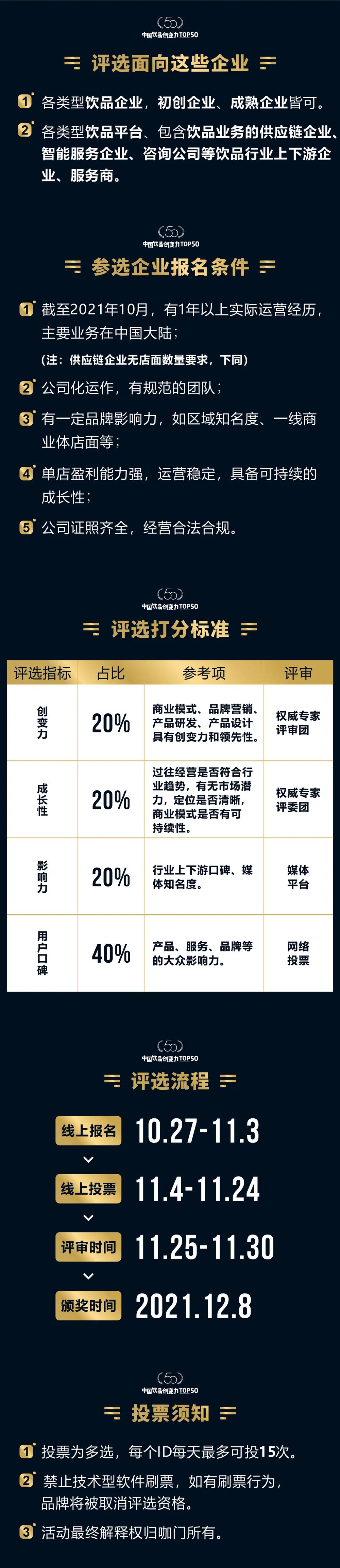 希望從“產(chǎn)品、營銷、空間、模式、場景、服務(wù)”六大維度,找到50種飲品的創(chuàng)新打開方式。參選品牌只要某一方面有亮點(diǎn)、有特色、有口碑即可參與報(bào)名,不限制規(guī)模、不局限營業(yè)額。- 2021年度戰(zhàn)略影響力品牌