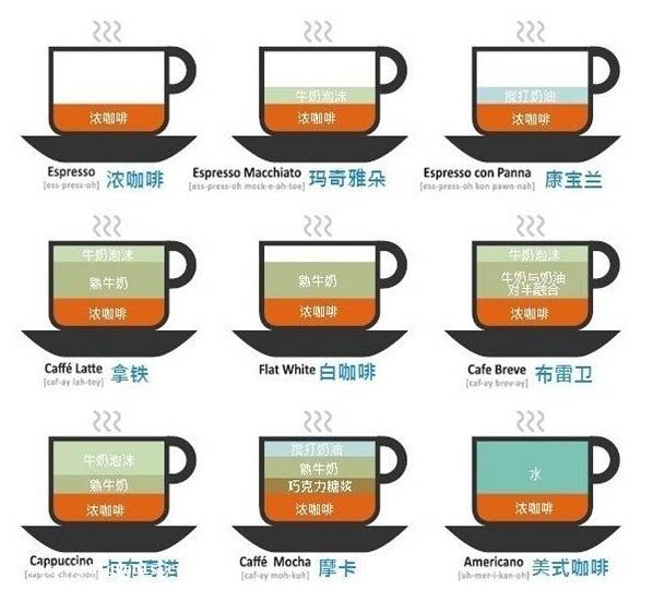 每日精品咖啡文化雜志咖啡行業(yè)交流請(qǐng)加私飲品界前街咖啡,微信號(hào):(長(zhǎng)按復(fù)制)IMAKECOFFEE 【轉(zhuǎn)載】滬江英語(yǔ)  咖啡已經(jīng)越來(lái)越深入地融入中國(guó)人的生活了,特別是對(duì)于年輕一代來(lái)講。  不過(guò),大家是否都清楚咖啡的各種分類呢?拿鐵、摩卡、卡普奇諾分別指的又是什么?  今天英語(yǔ)君就來(lái)科普一下這個(gè)問(wèn)題~ 順便普及一下和咖啡有關(guān)的英語(yǔ)詞匯~  1。 Espresso 意式咖啡  又叫“蒸餾咖啡”、“濃縮咖啡”、“意式八倍濃縮”  是用濃縮咖啡機(jī)(espresso machine)萃取出的咖啡精華(coffee essence),每份都是很小的一杯,非??唷! ∷牧吭~一般不用 cup,而用 shot?! ‖F(xiàn)在很多咖啡店都用 espresso 作為咖啡底料,然后調(diào)配出其他種類的咖啡?! ?。 Americano 美式咖啡  把1到2分意式咖啡(1-2 shots of espresso)加水稀釋(dilute),就成了美式咖啡?! ∑鋵?shí)就是黑咖啡(black coffee)  據(jù)說(shuō) americano 這個(gè)名字最早是意大利人拿來(lái)擠兌美國(guó)人的,“喝咖啡居然要加水?”  3。 Black Coffee 黑咖啡  于是,現(xiàn)在為了和美式咖啡區(qū)別開,就專門把直接用咖啡豆、咖啡粉煮出來(lái)的咖啡叫黑咖啡。  4。 Latte 拿鐵  在意式咖啡里加點(diǎn)牛奶,就成了拿鐵?! ⊥暾謶?yīng)該是“咖啡拿鐵”(coffee latte),因?yàn)?latte 在意大利語(yǔ)里就是“牛奶”的意思?! ∷?,好多人第一次去星巴克的時(shí)候以為“紅茶拿鐵”是紅茶味的咖啡,結(jié)果點(diǎn)來(lái)了發(fā)現(xiàn)就是杯奶茶。  話說(shuō),現(xiàn)在還流行一種和拿鐵很像的奶咖,叫醇藝白或者平白咖啡(flat white),從根本上講,就是奶加得少一點(diǎn),更能體會(huì)咖啡本來(lái)的風(fēng)味?! ?。 Au Lait 歐蕾  一種來(lái)自法國(guó)的咖啡,歐蕾跟拿鐵一樣,是一種加牛奶的咖啡。只不過(guò),它不是用意式咖啡做的,而是用普通的黑咖啡加奶,所以口味沒(méi)那么濃烈。  和拿鐵一樣,au lait 也是個(gè)簡(jiǎn)稱  全稱是 coffee au lait(歐蕾咖啡)  au lait 在法語(yǔ)里的意思是“和奶”?! ?。 Coffee Mocha/Mocha 摩卡咖啡/摩卡  在意式咖啡里,加入巧克力糖漿(chocolate syrup)和奶,再加上奶泡(milk foam)和巧克力碎屑(chocolate chips),就成了摩卡咖啡?! ?。 Cappuccino 卡布奇諾  在拿鐵的基礎(chǔ)上再加上一層奶泡,就成了卡布奇諾?! ≌?guī)的喝法是裝在預(yù)先加熱的陶瓷杯里(in a pre heated ceramic cup)。許多地方最后還會(huì)在頂上撒上巧克力粉(chocolate powder)?! ∷€有兩個(gè)變種:  wet cappuccino / light cappuccino  濕/輕卡布奇諾:比一般的卡布奇諾加更多的奶。  dry cappuccino / dark cappuccino  干/黑卡布奇諾:比一般的卡布奇諾加更少的奶?! ?。 Macchiato 瑪奇朵  如果不往意式咖啡里面加奶,而是直接加一層奶泡,那就成了瑪奇朵。  現(xiàn)在比較流行的喝法是在瑪奇朵上面淋上一點(diǎn)東西,  比如焦糖(caramel),這樣就成了焦糖瑪奇朵(caramel macchiato)  瑪奇朵通常是裝在玻璃杯里的?! 〔贿^(guò),現(xiàn)在國(guó)內(nèi)的好多瑪奇朵其實(shí)是拿鐵瑪奇朵,在濃縮咖啡的底下還倒了牛奶。  除此之外,  現(xiàn)在CostaCoffee還有一種常見的咖啡,叫:  可塔朵(Cortado)  從本質(zhì)上講就是迷你版的瑪奇朵?! ?。 Affogato 阿芙佳朵  這個(gè)詞在意大利語(yǔ)里的意思是“淹沒(méi)”?! ∷^的阿芙佳朵,就是一份意式咖啡+一份冰激凌,兩邊是分開裝的;吃的時(shí)候把熱騰騰的意式咖啡倒在冰激凌上。  冰激凌通常裝在一個(gè)小玻璃杯里,而意式咖啡裝在一個(gè)帶小嘴的陶瓷杯里,意大利人非常喜歡拿它當(dāng)甜點(diǎn)?! ‖F(xiàn)在比較流行的冰激凌口味有:  香草(vanilla)、摩卡、薄荷(peppermint)?! ?0。 Irish Coffee 愛爾蘭咖啡  愛爾蘭咖啡混合了一點(diǎn)神奇的東西:  愛爾蘭威士忌(whiskey)  頂上還要加一層奶油?! ∴?,是要加酒的,所以肯德基的愛爾蘭雪頂咖啡并不是愛爾蘭咖啡?! ?1。 Coffee Freddo 弗雷朵  弗雷朵這個(gè)名字聽著很玄乎,其實(shí)它還有個(gè)更接地氣的名字:  iced coffee(冰咖啡)  其實(shí)就是冰鎮(zhèn)的甜意式咖啡,裝在長(zhǎng)玻璃杯里,通常加冰?! ?2。 Espresso Romano 羅馬意式咖啡  也就是在一份意式咖啡旁邊放一片檸檬(a slice of lemon)?! ∩衿娴氖?,雖然這種咖啡叫羅馬意式咖啡,但這種搭配在意大利不常見,在美國(guó)倒是很常見。  13。 Ristretto 蕊絲翠朵  又叫力士烈特、十六倍意式濃縮,顧名思義,就是兩倍濃度的意式咖啡?! ∮⒄Z(yǔ)君的親身體驗(yàn):輕易不要嘗試,心臟不好不要喝,有胃病的也不要喝,睡不著覺(jué)的更不要喝;一杯下肚能讓你嗨到天荒地老?! K~  總結(jié)了這么多,其實(shí)大家應(yīng)該也發(fā)現(xiàn)了,各種咖啡基本上都是在5個(gè)元素之間玩花樣:espresso、水、奶、奶泡、巧克力?! ∨紶枙?huì)有愛爾蘭咖啡這種加酒的飲料亂入?! ∷?,有網(wǎng)友總結(jié)了一張很帶感的圖,可以概括大部分咖啡:  最后,  再送給大家一些形容咖啡的詞匯: Flavor【風(fēng)味】是香氣、酸度、苦度、甜度和醇度的整體印象,可以用來(lái)形容對(duì)比咖啡的整體感覺(jué)。    Acidity【酸度】是所有生長(zhǎng)在高原的咖啡所具有的酸辛、強(qiáng)烈的特質(zhì)。此處所指的酸辛與苦味或發(fā)酸(sour)不同,也無(wú)關(guān)酸堿值,而是促使咖啡發(fā)揮提振心神