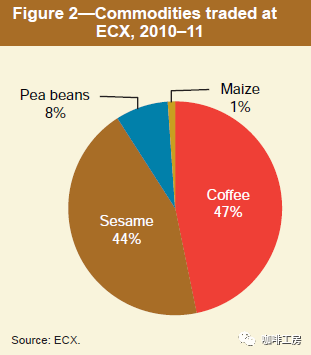 圖 ECXlogo來源ECX 2008年3月,埃塞成立了埃塞國家商品交易中心(ECX Ethiopia Commodity Exchange),咖啡作為其中主要交易品項之一,占據(jù)了近一半的交易份額。