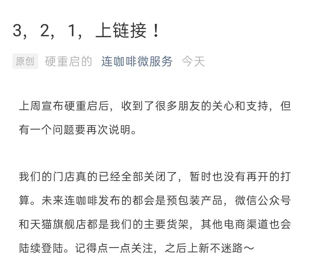 據(jù)連咖啡公眾號(hào)內(nèi)容顯示,未來(lái)連咖啡發(fā)布的都會(huì)是預(yù)包裝產(chǎn)品,微信公眾號(hào)和天貓旗艦店都是我們的主要貨架,其他電商渠道也會(huì)陸續(xù)登陸。事實(shí)上,連咖啡的這一宣布也不是毫無(wú)征兆。早在今年年初,連咖啡就接二連三被指出多家門(mén)店處于暫停營(yíng)業(yè)狀態(tài)。9月3日,連咖啡在公眾號(hào)「連咖啡微服務(wù)」發(fā)布了一篇標(biāo)題為「《消失100多天后,我回來(lái)了》」文章,宣布「硬重啟回歸」,不過(guò)不同于以往的品牌重啟業(yè)務(wù),連咖啡宣布:此次回歸在產(chǎn)品形態(tài)上和渠道上都做出了巨大的改變。其中,在產(chǎn)品上,連咖啡將包括但絕不限于膠囊、濃縮液、凍干粉、冷萃液、瓶裝咖啡等產(chǎn)品。在渠道方面除微信公眾號(hào)和小程序外,連咖啡還將在天貓、便利店等進(jìn)行布局,服務(wù)范圍將從北上廣深擴(kuò)大到全國(guó)。將由原來(lái)的微信單一渠道+一線城市窄覆蓋變?yōu)槿?多維度產(chǎn)品覆蓋,在新業(yè)務(wù)上線后,連咖啡將全面升級(jí)為一家咖啡零售公司。此次連咖啡也再次說(shuō)明補(bǔ)充:微信公眾號(hào)和天貓旗艦店才是他們的主要貨架。而針對(duì)關(guān)閉所有的門(mén)店對(duì)于消費(fèi)者的之前在在門(mén)店充值剩余的咖啡券,連咖啡也給出解釋,連咖啡表示:消費(fèi)者可以公眾號(hào)對(duì)話框聯(lián)系客服,可以將咖啡券轉(zhuǎn)成商城預(yù)存金額。天眼查數(shù)據(jù)顯示,連咖啡自2014年成立起共完成7輪融資,總計(jì)超過(guò)4億元人民幣。2017年連咖啡首度實(shí)現(xiàn)盈利,當(dāng)時(shí)連咖啡是除了星巴克咖啡外唯一盈利的咖啡品牌,不過(guò),作為互聯(lián)網(wǎng)咖啡創(chuàng)業(yè)的頭一波品牌,連咖啡最近兩年并不好過(guò),最近幾年連咖啡前前后后經(jīng)歷了多次大規(guī)模閉店,或因公司資金鏈斷裂,或因疫情影響。