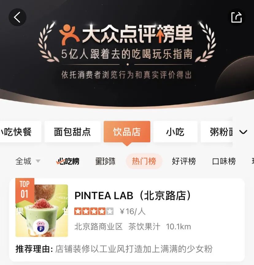PINTEA 目前推出 15 個(gè) SKU,包含鮮果茶、優(yōu)選原葉茶等,定價(jià)在 15~25 元之間。開業(yè)兩周,這家店登上了所在區(qū)域大眾點(diǎn)評(píng)熱門榜單第一名。小紅書上,它成了種草和安利的“紅人”,其中牛油果產(chǎn)品系列出鏡率最高。