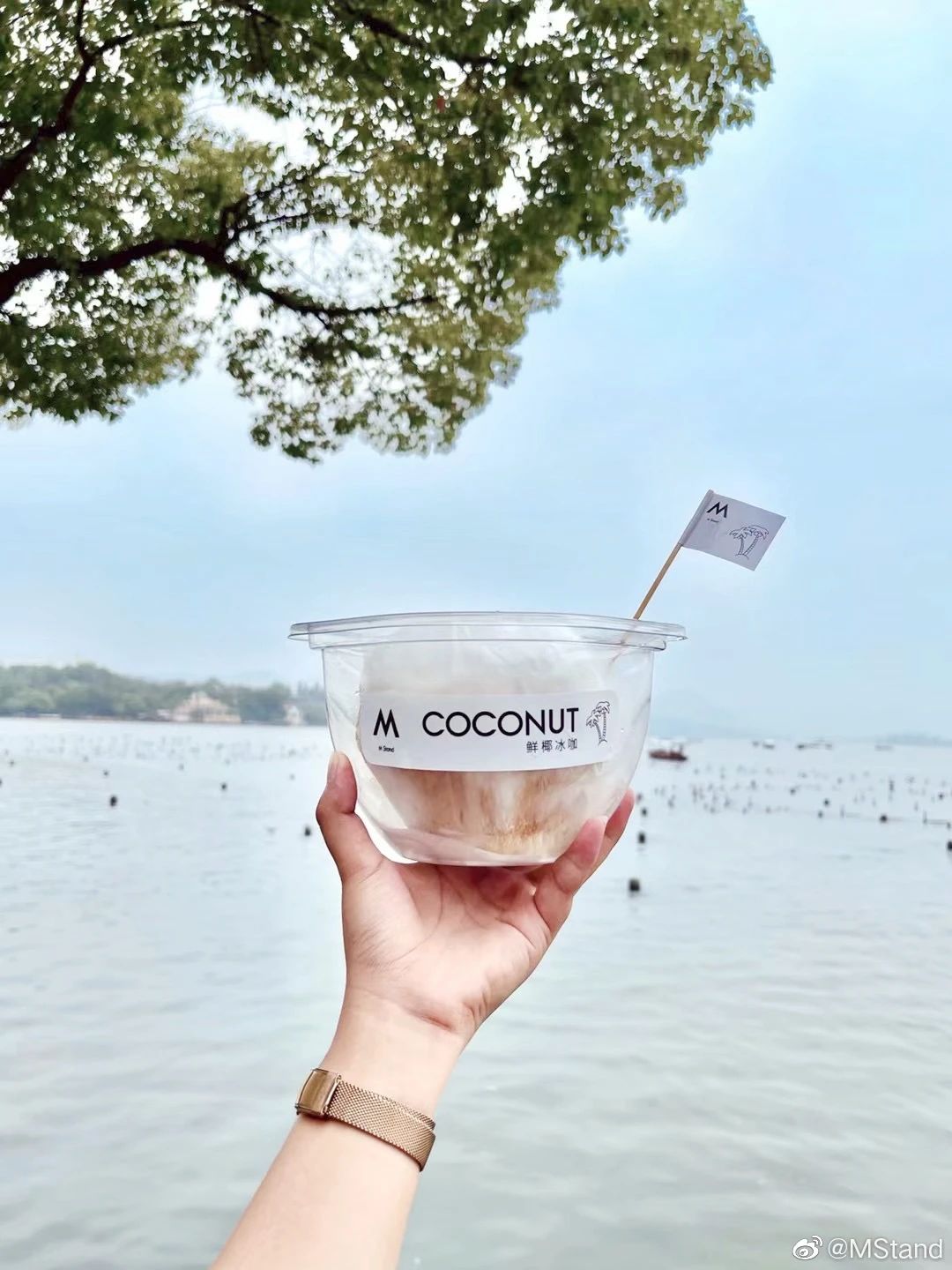 M stand是一個善于在咖啡上做創(chuàng)意的品牌。5月底, M stand推出一款“椰子蛋咖啡”,將椰子放在一個透明的矮胖容器內(nèi),咖啡師萃取濃縮液后,用一個金屬質(zhì)感“注射器”,將濃縮液注入椰子內(nèi)部。這個產(chǎn)品在社交平臺上也備受關(guān)注。