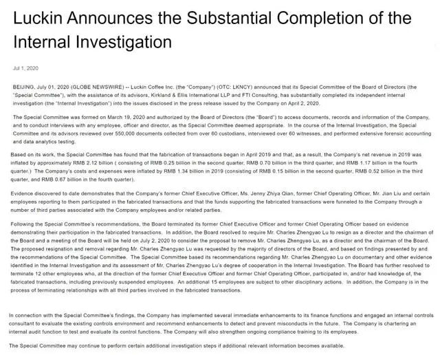 內(nèi)部調(diào)查稱,截至目前發(fā)現(xiàn)的證據(jù)顯示:前首席執(zhí)行官錢治亞,前首席運營官劉劍和向其報告的某些雇員參與偽造交易,而支持偽造交易的資金被用于通過與公司員工和/或關聯(lián)方相關聯(lián)的許多第三方。除此之外,瑞幸咖啡公告指出:除前CEO錢治亞和前COO劉劍之外,瑞幸咖啡董事長陸正耀參與了造假,并且對內(nèi)部調(diào)查不予配合。在7月2日的董事會會議上,董事們將對罷免陸正耀董事和董事長職務的事項進行審議,但該會議的最終結果仍然難以預料。
