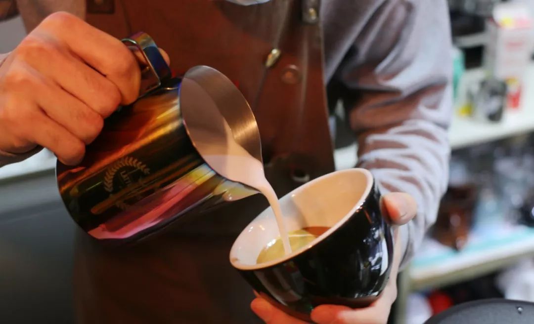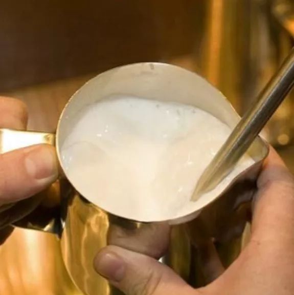 再次打開蒸汽桿,聽著幾聲呲呲聲,牛奶液面產(chǎn)生漩渦并慢慢翻滾起來。直到奶缸燙手即關(guān)掉蒸汽開關(guān),并把奶缸從蒸汽杠中取出,10秒左右牛奶便成為如酸奶般粘稠細膩的奶泡。這一步是最難但最有成就感的一步。很多咖啡師經(jīng)歷了無數(shù)個咖啡館打烊的夜晚,獨自一人默默練習(xí),用掉無數(shù)箱牛奶,才終于學(xué)會了拉一個最簡單的愛心。