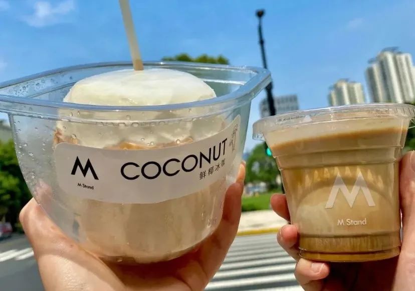 這種“野生操作”產(chǎn)品,也被連鎖品牌看上了。5月底,上海連鎖咖啡品牌M Stand,在旗下30家門店上新了這款產(chǎn)品,并在社交平臺迅速走紅。M stand還自創(chuàng)了一種更具觀賞性的做法:一顆頂部去殼留肉的白胖“椰子蛋”,放在一個(gè)透明的矮胖容器內(nèi),咖啡師萃取濃縮液后,用一個(gè)金屬質(zhì)感“注射器”,將濃縮液注入椰子內(nèi)部,一款新穎有趣的咖啡就出杯了。