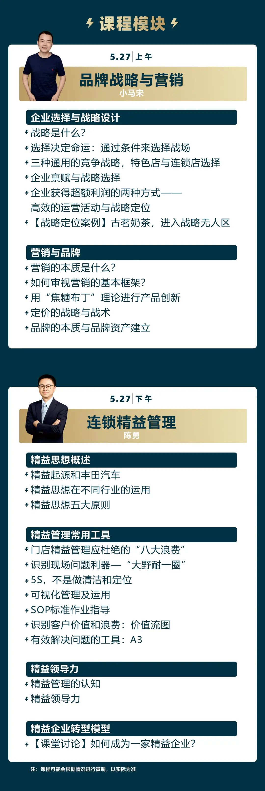 學(xué)習(xí)頭部品牌,但能學(xué)到的大都是表象,缺乏內(nèi)生邏輯,與自身不匹配,甚至逐漸丟了自己的特色。在實(shí)際發(fā)展中一旦問題顯形,就需要付出極大的調(diào)整成本。我們想讓品牌在成長期,快速抓住自身競(jìng)爭優(yōu)勢(shì),減少踩坑幾率與試錯(cuò)成本,以品牌化、規(guī)?;悸钒l(fā)展,同時(shí)打造一個(gè)品牌決策層能建立聯(lián)系、深入交流的空間?!覀兓I備了這堂“大咖私享課”。第1期,講什么課題?“大咖私享課”的首期,我們選擇了“品牌戰(zhàn)略與營銷”“連鎖門店精益管理”兩個(gè)課題。一個(gè),是品牌抓住自身真正優(yōu)勢(shì)的指導(dǎo)思路,形成經(jīng)營、傳播的有效打法,能推進(jìn)品牌“出圈兒”。比如7分甜,這個(gè)創(chuàng)立于蘇州的品牌,用一套系統(tǒng)的品牌戰(zhàn)略設(shè)計(jì),抓住具辨識(shí)度的形象輸出和品類打法,創(chuàng)造過單店“換個(gè)門頭營業(yè)額漲3倍”的神話。在2019到2020年間,7分甜門店數(shù)量翻了5倍,在上海這個(gè)飲品高地站住了腳跟,而今,開始加速走向全國市場(chǎng)。一個(gè),是企業(yè)提升內(nèi)部效率的管理路徑,發(fā)現(xiàn)日常營運(yùn)中潛藏的浪費(fèi)。做好了是優(yōu)化成本同時(shí)快速發(fā)展的強(qiáng)大助力。比如西貝,會(huì)通過預(yù)估客流、安排合適人手、工作站崗位細(xì)分三方面推進(jìn)精益排班,解決餐飲常遇見的高峰人員不足、閑時(shí)人力過剩問題。據(jù)了解,這得以讓西貝員工平均每天每人省時(shí)2個(gè)工時(shí),很大程度上節(jié)省了人力資源。我們邀請(qǐng)到這兩個(gè)領(lǐng)域的專家,也是具備飲品行業(yè)服務(wù)經(jīng)驗(yàn)的實(shí)踐者,獨(dú)立營銷顧問小馬宋,精益服務(wù)總監(jiān)陳勇。兩位講師將以專業(yè)體系與實(shí)際案例,從這兩個(gè)方面,幫助品牌決策層建立戰(zhàn)略認(rèn)知,理解精益管理,讓品牌在競(jìng)爭中率先提速。這節(jié)課講什么?