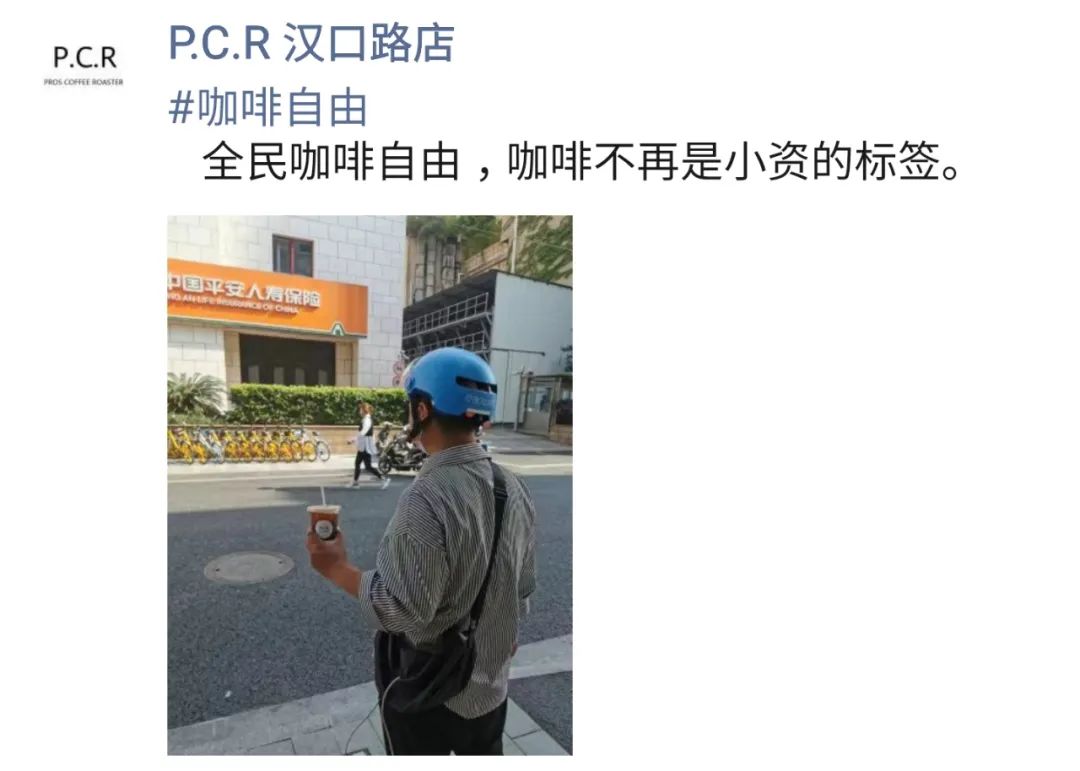 P.C.R的創(chuàng)始人告訴我,周?chē)放频拈T(mén)店裝修,都比較偏“高大上”,路過(guò)的人可能會(huì)覺(jué)得消費(fèi)一杯咖啡有點(diǎn)壓力。“我們開(kāi)這樣一家檔口店,是希望消費(fèi)者可以隨時(shí)接觸到服務(wù)員,能很方便地問(wèn)一下咖啡是多少錢(qián),感受到自己可以消費(fèi)得起這杯咖啡,從而去嘗試?!焙?jiǎn)單樸素的裝修,帶給消費(fèi)者的是平易近人的感受。從門(mén)頭開(kāi)始,P.C.R就降低了顧客來(lái)喝一杯咖啡的門(mén)檻。2. 倡導(dǎo)“全民咖啡自由”,打造品牌標(biāo)簽P.C.R一直在門(mén)店、消費(fèi)群體中,倡導(dǎo)“全民咖啡自由”,并形成了自己的標(biāo)簽。