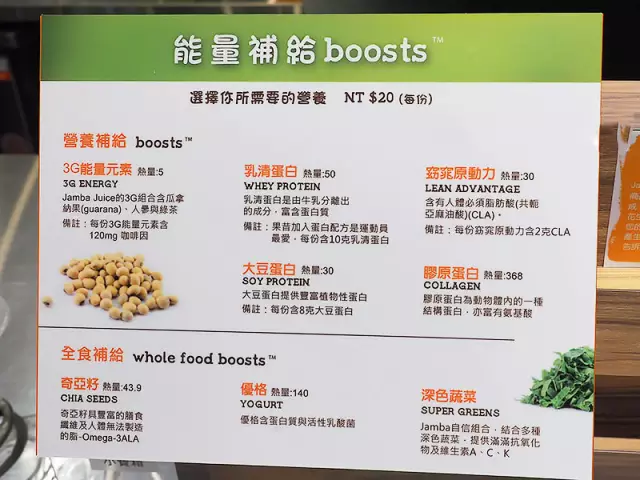 Jamba Juice,主打24~33元果昔,果汁不加水和糖,可搭配低脂的雪波冰淇淋、優(yōu)格,或自選蔬菜、豆奶等,吸引20~40歲消費人群。除了完全取之自然的食材,Jamba Juice的另一項特色就是「Boots能量補給配方」顧名思義就是能增加人體所需的營養(yǎng),象是膠原蛋白、乳清蛋白或是富含膳食纖維的奇亞籽等等,可供大家與果昔搭配,健康加倍!