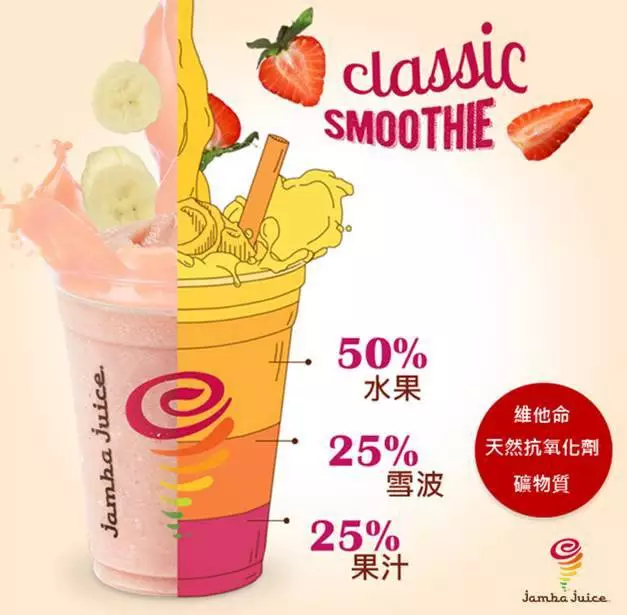 Jamba Juice推出的果昔(Smoothie)不是奶昔也不是冰沙,更不是純粹的果汁,這款新食尚是由新鮮精選的水果搭配雪波(sorbet)或優(yōu)格,以特制比例呈現(xiàn)水果的自然風(fēng)味,形成比果汁更濃郁綿密的口感。