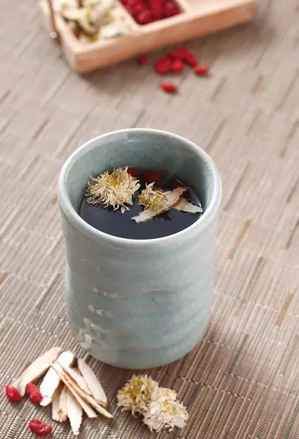 作法:1.把菊花用清水清洗干凈備用,將菊花、西洋參、桂圓和枸杞放入保溫杯中。2.最后倒入熱開水浸泡約5分鐘即可。
