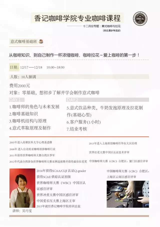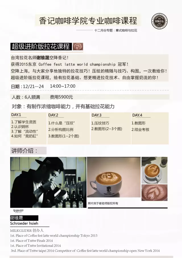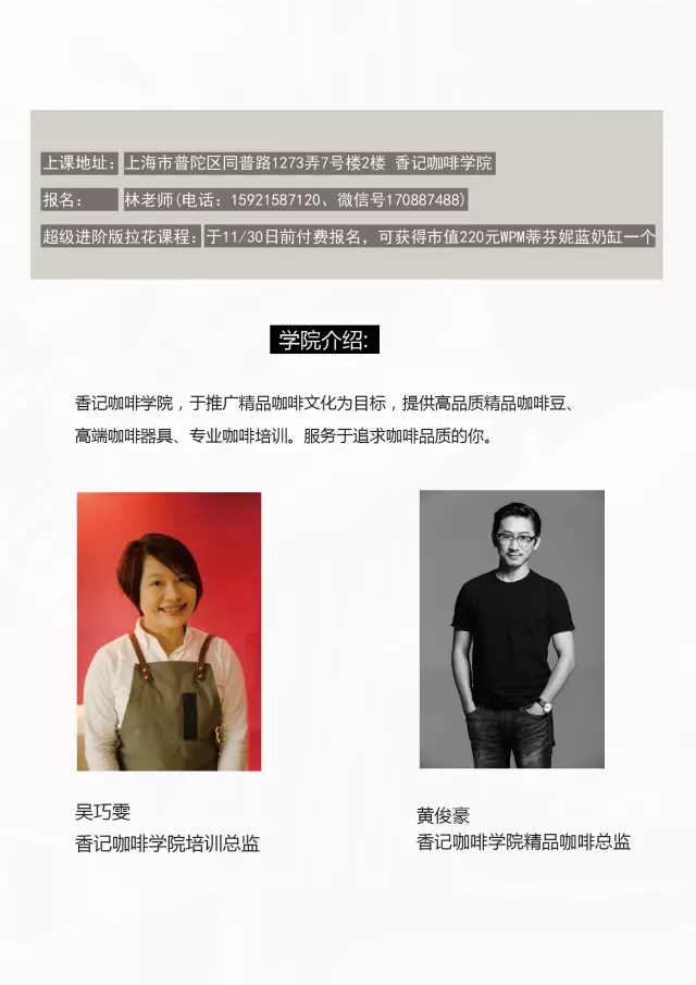 12月除了有【經(jīng)典意式咖啡基礎(chǔ)班】之外,香記咖啡學(xué)院還邀請(qǐng)到一位重量級(jí)導(dǎo)師——臺(tái)灣咖啡拉花小王子、2015年Coffee Fest Tokyo世界拉花冠軍—謝維晟老師,為大家開設(shè)【超級(jí)進(jìn)階版拉花課程】。重要信息哦!凡在11月30日前報(bào)名并且付費(fèi)成功【超級(jí)進(jìn)階版拉花課程】的學(xué)員,可獲得市值220元WPM蒂芬妮藍(lán)拉花奶缸一個(gè)。報(bào)名方式:15921587120、微信號(hào)170887488,林老師上課地址:上海市普陀區(qū)同普路1273弄7號(hào)樓2層,香記咖啡學(xué)院