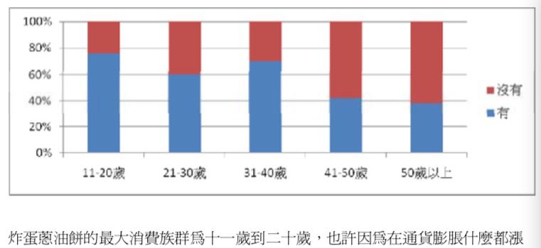臺灣小吃文化研究機構(gòu)特別針對炸蛋蔥油餅市場做過一份調(diào)查顯示,炸蛋蔥油餅的主要消費年齡層與內(nèi)地茶飲市場高度一致,都為年輕族群。