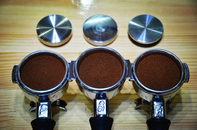 借用WBC世界冠軍Matt Perger文章里的圖片大家可以看到,越是貼合粉碗尺寸的壓粉器,在壓粉時(shí)殘存在粉碗壁的咖啡粉就越少,有很多咖啡師有壓完粉敲一下把手的習(xí)慣,目的是為了把粘在粉碗壁上的殘粉震下來,你們有沒有想過這是因?yàn)槟銈冞x擇的壓粉器不合適造成的呢,偉哥用過SYNESSO的原裝RB壓粉器,簡(jiǎn)直無敵,幾乎沒有一點(diǎn)殘粉,La Marzocco原裝的壓粉器稍微遜色一點(diǎn),但是也非常順手。4.特殊形狀壓粉器,再看下圖,三個(gè)錘底對(duì)應(yīng)三個(gè)粉面:螺紋,弧底,平面