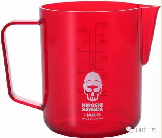 7、Saerdna Pitcher,特殊的把手設計,它與把手上下連接的普通奶缸不同,做成了末端開放式,用來解放被把手束縛而感到不適的小拇指,專門適用于手大的咖啡師,并且上端的凹弧更是復合人體工程學設計,讓你用不同握法握起來都特別的舒適,SP缸嘴比RW更尖,缸口做的更薄,比GEAR的開口夾角更長,取消了翻嘴。這樣會使得SP在制作上導流更通暢,更容易做細水流圖形,并且更接近液面,讓液體流出的總量更多,使得超薄奶沫也容易成型。對于這款缸,個人覺得在制作定位組合圖形上更優(yōu)于壓紋流動型圖形,因為SP大開口夾角的設計,使得奶沫相比較其他奶缸(GEAR,RW,EV,WPM)在同時間內(nèi)流出的液體總量更多,奶沫更多,所以更容易成型。如果是喜歡組合圖形的咖啡師,很合適使用。