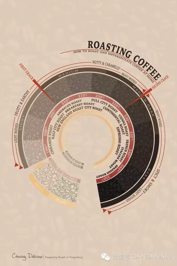 先來這張圖,分享咖啡從生豆到每一種烘焙顏色的差異。烘焙程度簡單的說就是「溫度的高低配合時間的長短」所得出來的各種結(jié)果,聽起來和烤個雞腿或烤個蛋糕差不多。哈哈~但并非如此~就不在此多說了,咖啡烘焙是個專業(yè)的技術(shù)和認(rèn)證,可以留在更專業(yè)的帖子里講。