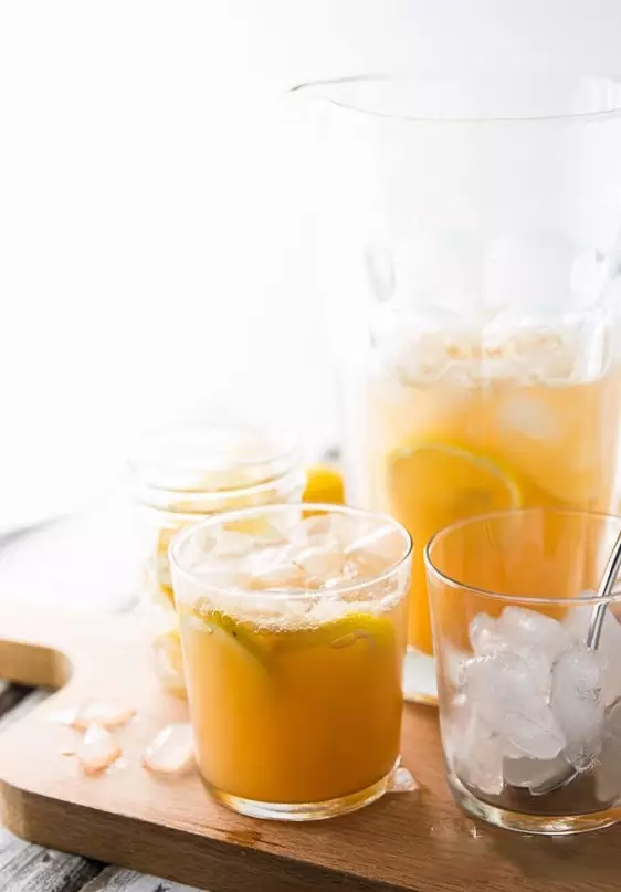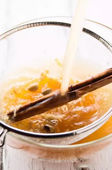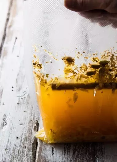 2.將檸檬皮、檸檬、糖、檸檬果肉、小豆蔻和肉桂放入袋中,倒入茶和龍舌蘭。將袋子密封,在熱水中泡上2小時,晾涼30分鐘,再放入冰箱中15分鐘。