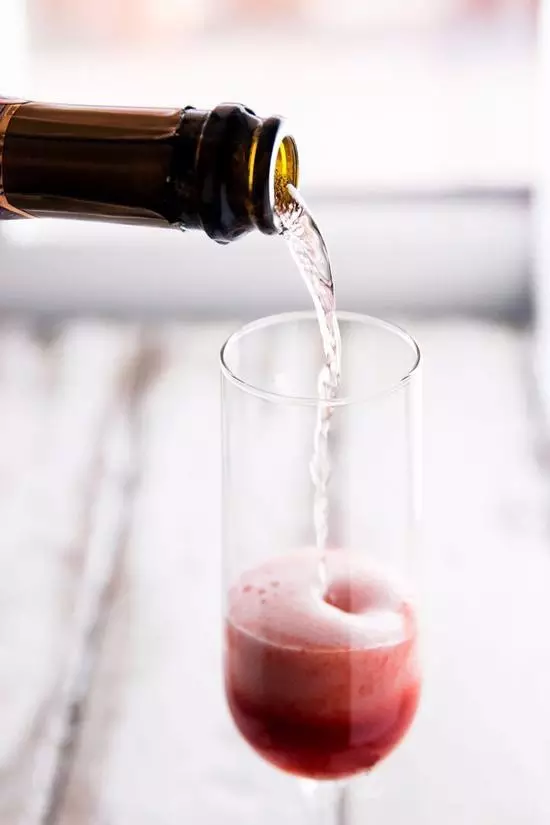 3.將混合物放在杯子底部,加入草莓醬,再在杯中倒入氣泡酒。