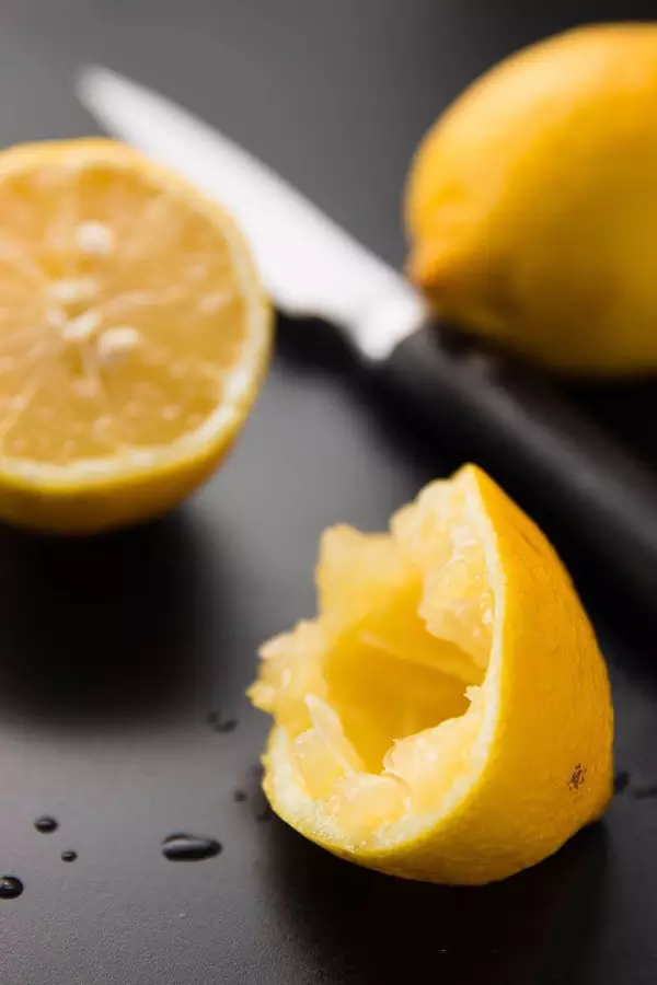 1.先將綠茶放入水中煮熟。再將檸檬切開,挖出中心部分。