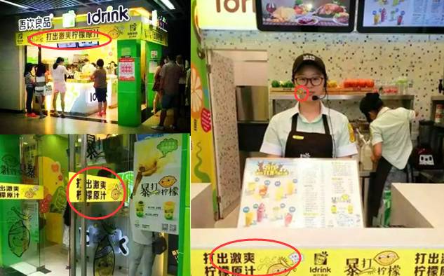 巧妙的是,為配合宣傳,吾飲良品店面全副武裝,請(qǐng)看下圖,是否消費(fèi)者視線所及之處全都是主打產(chǎn)品?連收銀姑娘臉上都貼上了暴打創(chuàng)可貼。