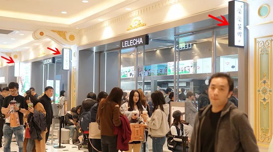 樂樂茶制茶工廠圖片店鋪在環(huán)球港,幾乎一整排都是樂樂茶的店鋪,門頭沒有中文名只有LELECHA的英文名(可能因?yàn)橛⑽目雌饋碛斜聘褚稽c(diǎn)吧),但每根柱子上有一盞豎燈。