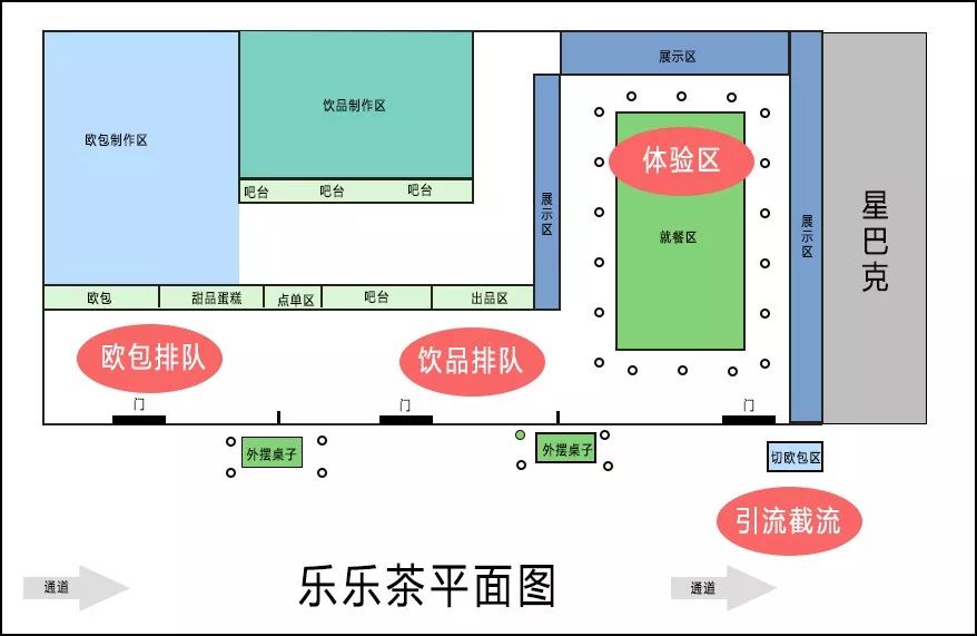 上面這張是我們畫的樂樂茶的簡單平面圖,通過圖片我們能很清晰的看清楚他們的規(guī)劃,店鋪總體規(guī)劃分成了4個主要的區(qū)域:引流區(qū)、截留區(qū)、轉(zhuǎn)化區(qū)(歐包、茶飲)、體驗(yàn)區(qū)。(這些在營銷課程都會講到)