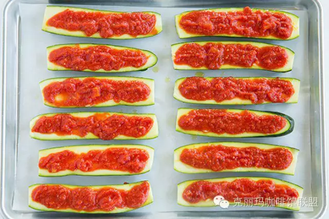 2.大碗中放入橄欖油和蒜蓉,混合均勻,涂在西葫蘆上,然后撒上鹽和黑椒,接著每條分別涂上大約1tbsp的Pizza醬(邊緣一圈不涂醬)。