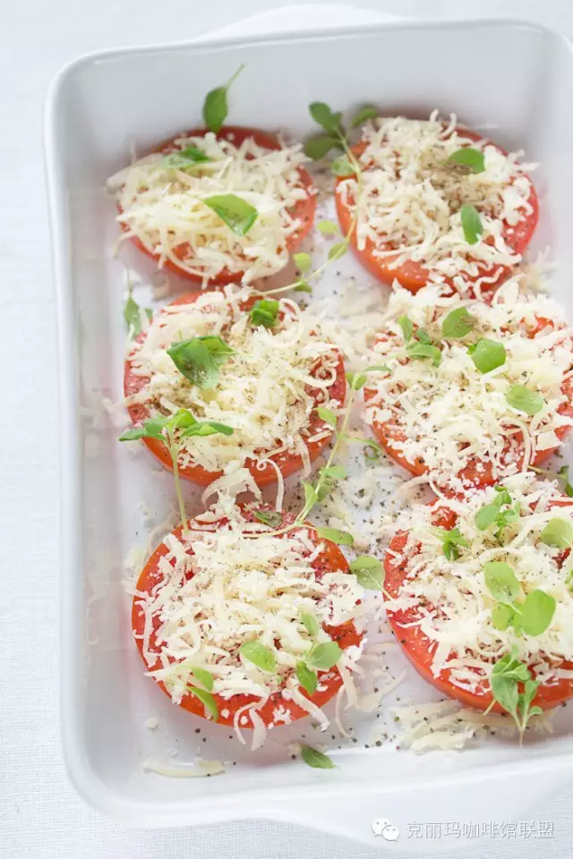 材料:2個(gè)中型的西紅柿、1/3杯巴馬臣芝士碎(大概50g,你也可以用馬蘇里拉芝士碎代替,首選低脂)、牛至葉碎、鹽、黑椒和橄欖油適量。牛至葉用新鮮的最好,沒有的話可以用超市就有賣的干香料代替。