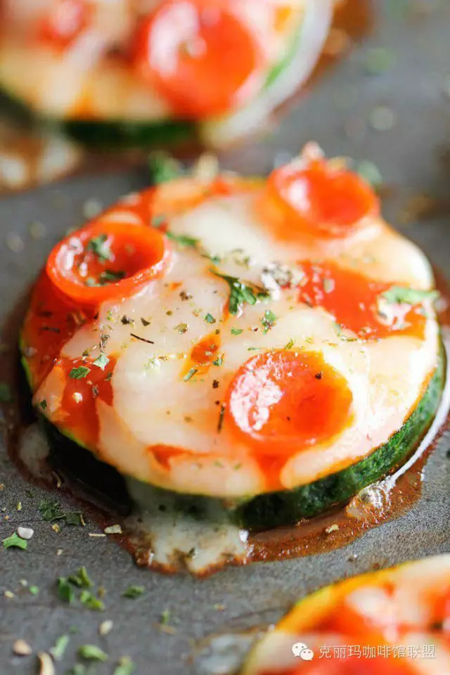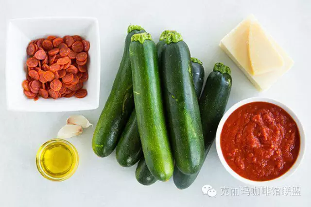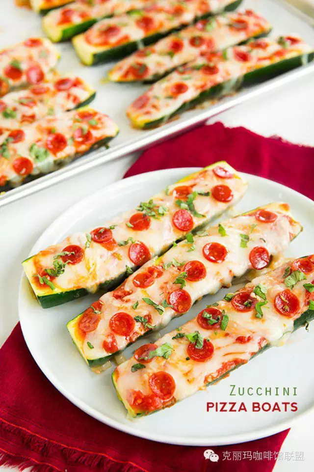 材料:6個(gè)小的西葫蘆(節(jié)瓜)、1tbsp橄欖油、1-2個(gè)蒜瓣(切碎)、鹽和黑椒適量、1杯低卡的蒜香西紅柿Pizza醬或者是意粉醬(你也可以選擇自己煮)、1.5杯低脂馬蘇里拉芝士碎、1/3杯低脂巴馬臣芝士碎、1/2杯小西紅柿、2tbsp牛至葉碎(最好用新鮮的,沒有的話可以用超市就有賣的干香料代替)