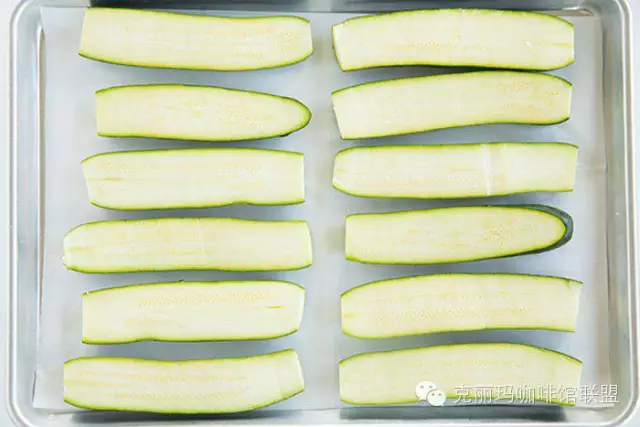 1.烤箱預(yù)熱至204攝氏度。大烤盤上鋪一張烘焙油紙。西葫蘆洗凈后對(duì)半切開(如果無法平放,可以在底部切出一個(gè)平面,這樣會(huì)比較穩(wěn)),用廚房紙印干切開的一面,然后整齊放在烘焙油紙上。