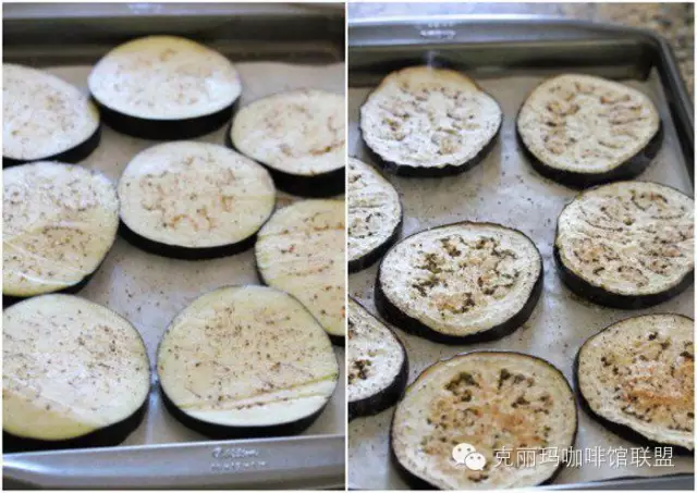 1.烤箱預(yù)熱至218攝氏度,大烤盤上鋪一層烘焙油紙,放上切片的茄子,撒鹽烤15-20分鐘。