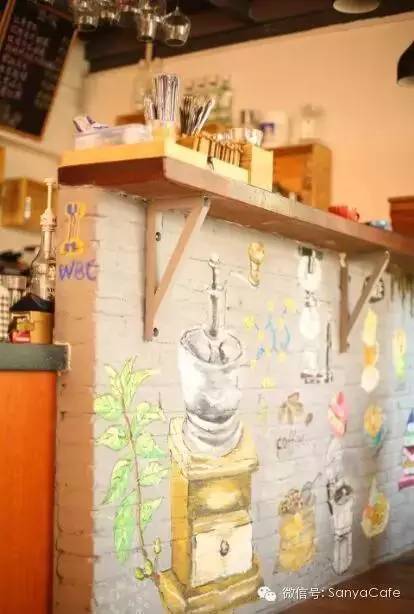 新吧臺(tái)建好后,外墻蒼白單調(diào),恰好幾位員工是三亞學(xué)院雕塑系的,還有一位是瓊州學(xué)院學(xué)室內(nèi)設(shè)計(jì)的,都有美術(shù)功底。找了些圖讓他們幫忙手繪上墻。