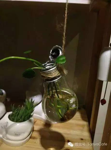在網(wǎng)上看到的DIY,剛好店里燈泡壞了,就隨手做了一個(gè),后來店里只要燈泡壞就拿來做水培花瓶。