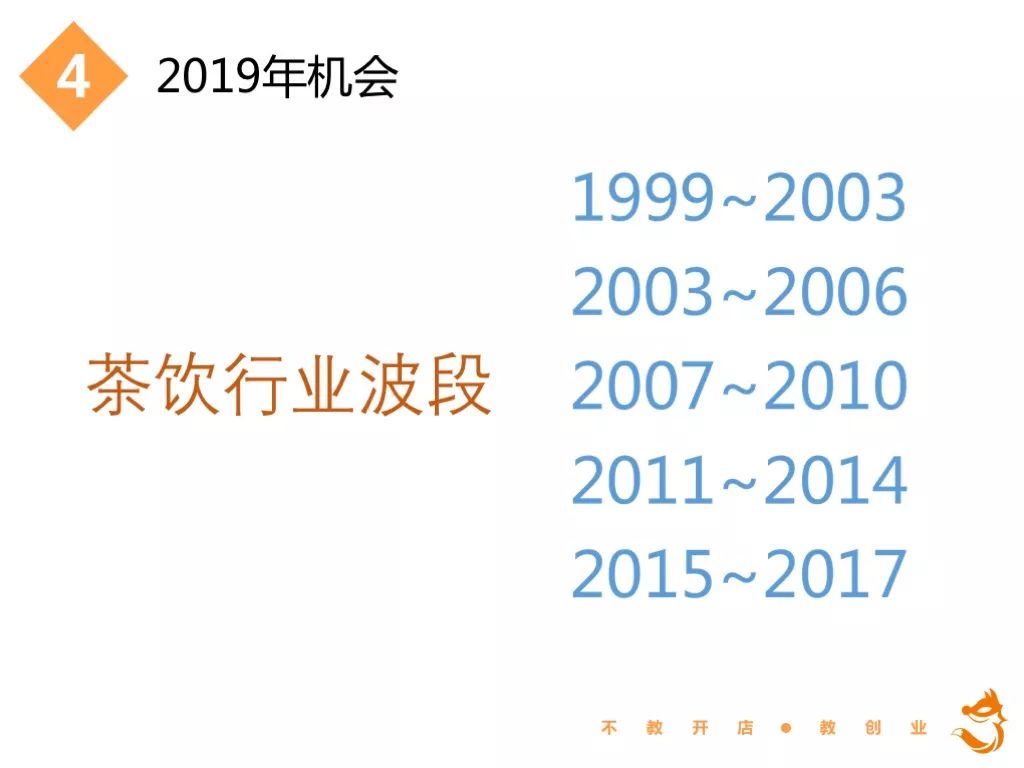 到了2015年以后呢,大家會(huì)看到,類似于喜茶有茶這些水果茶的模式再出來。其實(shí)這里面我們可以看到很有意思的地方:每3年整個(gè)行業(yè)都是一個(gè)波段。