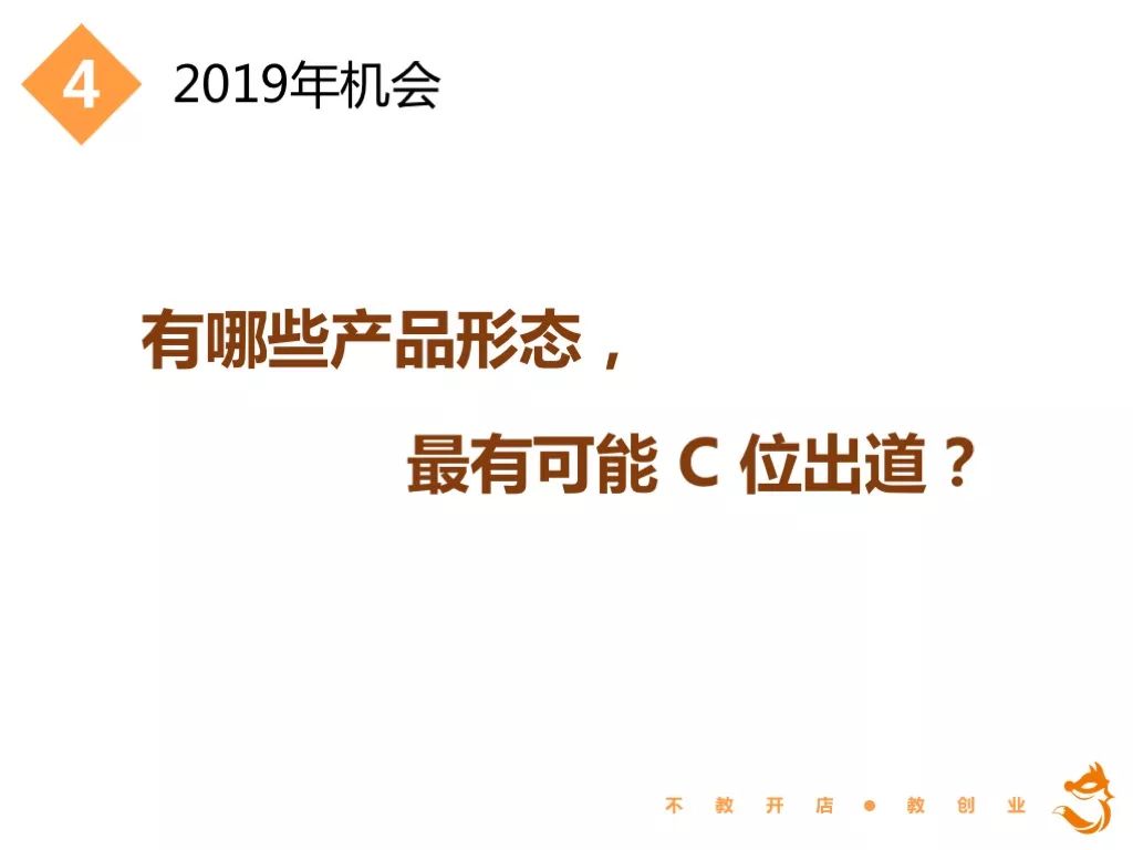 我就很了解很詫異說為什么?后來才發(fā)現(xiàn)他說他們的店,都是在冬天開,知道十一以后是開店高峰高峰期。我認(rèn)為一些活下來的一些品牌啊,在市場(chǎng)的很多個(gè)點(diǎn)上把控還是做的很好的。因?yàn)槎齑_實(shí)是準(zhǔn)備創(chuàng)業(yè)最好的一個(gè)時(shí)間點(diǎn)啊,這個(gè)下面會(huì)再提一提。那2019年呢,到底整個(gè)機(jī)會(huì)在哪里呢?