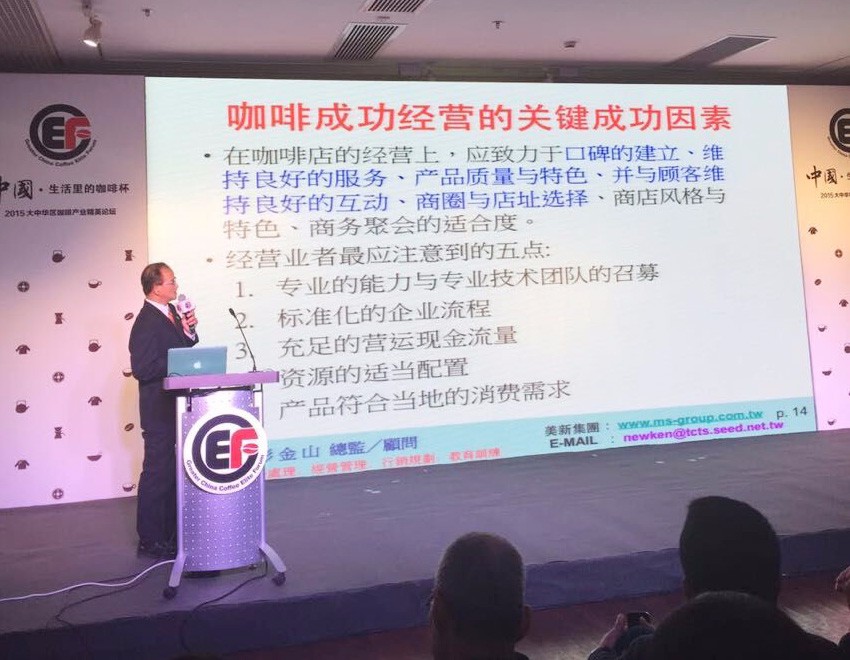彭金山,美新集團執(zhí)行總監(jiān)、首席顧問,十年輔導(dǎo)近兩百家企業(yè)成功創(chuàng)業(yè),并輔導(dǎo)100家臺灣各型企業(yè)取得人力資源質(zhì)量系統(tǒng)認(rèn)證。3月28日,在2015年GCEF大中華咖啡產(chǎn)業(yè)菁英論壇上,他就如何成功開一家咖啡連鎖店發(fā)表了自己的演講。