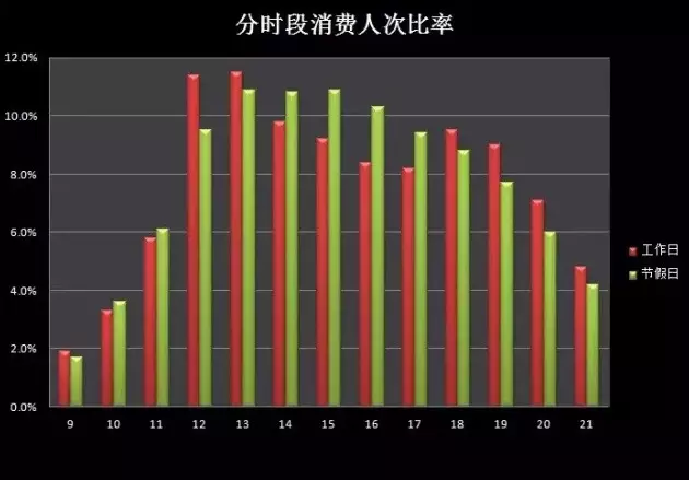 門店營業(yè)時間從早9點到晚10點,紅色柱表明工作日消費數(shù)據(jù),消費的高峰時段在中午12和13點,表明用戶更喜歡在午飯后喝奶茶。而在節(jié)假日,消費的高峰時段是下午13點到16點,表明多數(shù)用戶選擇在這個時間段逛街休閑