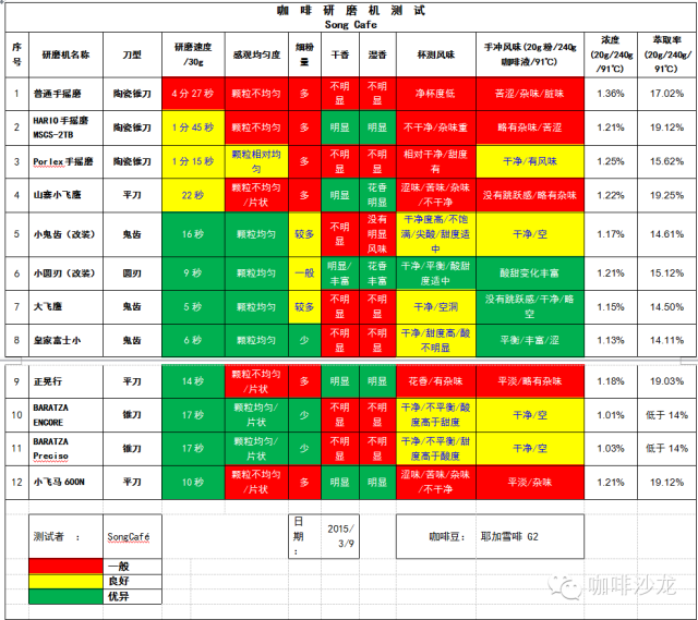 個(gè)人建議經(jīng)過兩輪的數(shù)據(jù)記錄和分析,我們認(rèn)為性價(jià)比最高的是圓刃刀片研磨機(jī),無論從初學(xué)者的經(jīng)濟(jì)投入還是技術(shù)穩(wěn)定性來說都是非常合適的。反觀平刀研磨機(jī),無論普通平刀還是所謂精平刀,最后的各項(xiàng)參數(shù)表現(xiàn)差異都不大。陶瓷錐形刀的手搖研磨機(jī)我們不建議作為吧臺(tái)出品使用。結(jié)語任何研究與測試都會(huì)有局限性,我們僅僅只對自己能認(rèn)知到的東西加以總結(jié)分析,研究過程中難免會(huì)有錯(cuò)誤或偏頗。希望我們的測試能成為一個(gè)拋磚引玉的開始,大家平時(shí)在學(xué)習(xí)咖啡技術(shù)知識(shí)的同時(shí)還要用研究的方法來做各種實(shí)驗(yàn),這樣大家才能擺脫人云亦云的局面,謝謝!圖文/Song Café2015/4/27