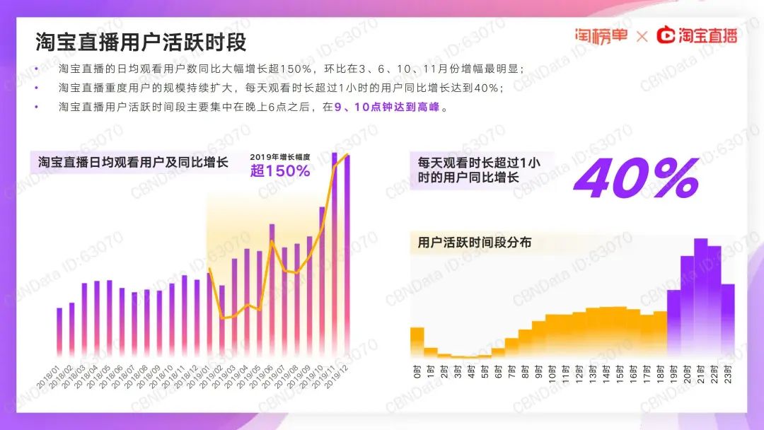 淘寶直播的日均觀看用戶數(shù)同比大幅增長超150%,環(huán)比在3、6、10、11月份增幅最明顯;淘寶直播重度用戶的規(guī)模持續(xù)擴(kuò)大,每天觀看時(shí)長超過1小時(shí)的用戶同比增長達(dá)到40%;淘寶直播用戶活躍時(shí)間段主要集中在晚上6點(diǎn)之后,在9、10點(diǎn)鐘達(dá)到高峰。