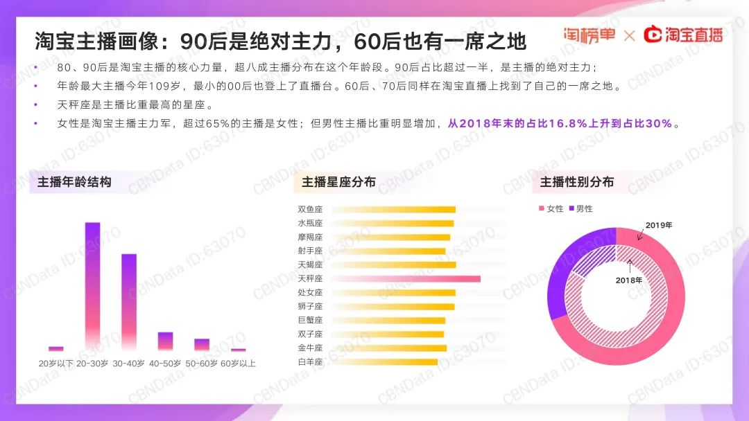 天秤座是主播比重最高的星座。女性是淘寶主播主力軍,超過65%的主播是女性;但男性主播比重明顯增加,從2018年末的占比16.8%上升到占比30%。