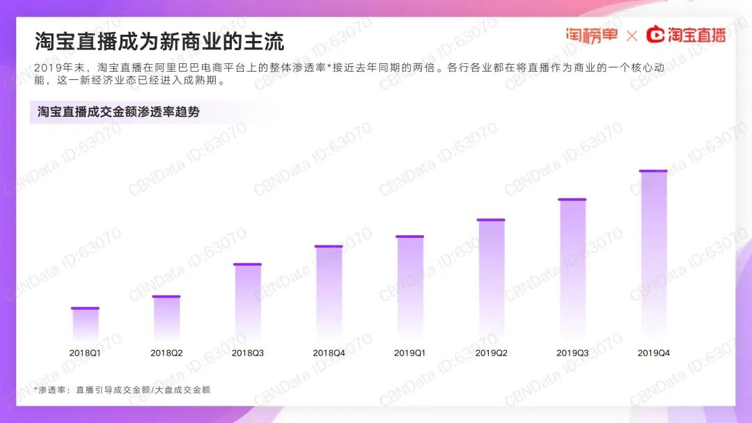 淘寶直播成為新商業(yè)主流2019年末,淘寶直播在阿里巴巴電商平臺(tái)上的整體滲透率接近去年同期的兩倍。各行各業(yè)都在將直播作為商業(yè)的一個(gè)核心動(dòng)能,這一新經(jīng)濟(jì)業(yè)態(tài)已經(jīng)進(jìn)入成熟期。