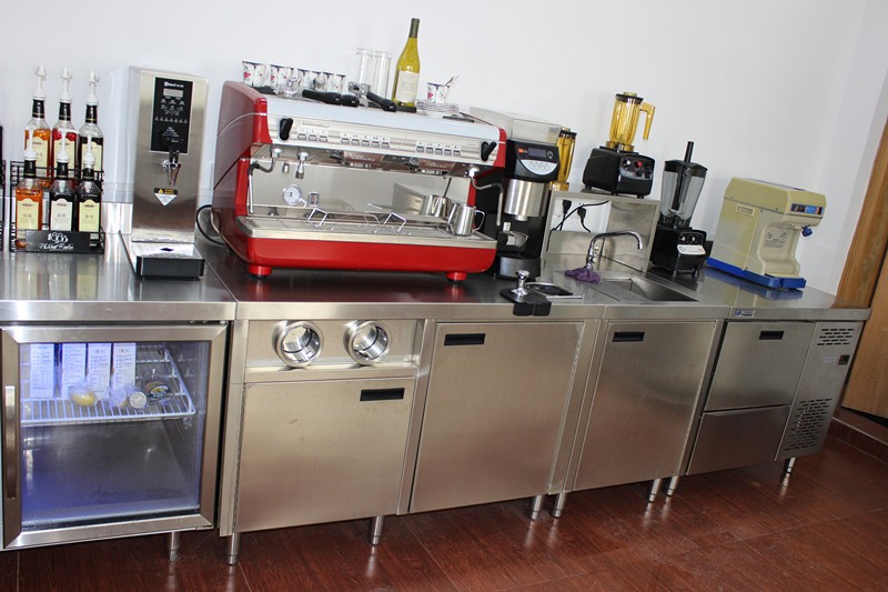 不銹鋼吧臺(tái)是員工工作的地方,吧臺(tái)表面常與人打交道,因此臺(tái)面要結(jié)實(shí)、耐磨、耐火,有水槽的吧臺(tái)要耐水。不銹鋼吧臺(tái)最為突出的就是將水槽和臺(tái)面融為一體,堅(jiān)硬度和抗震度等各項(xiàng)性能較為優(yōu)秀,特別是經(jīng)過(guò)壓花、拉絲處理的不銹鋼臺(tái)面不僅光潔明亮、美觀高雅,而且抗摩擦、耐溫性強(qiáng),較好地解決了滲透、龜裂、變形等問(wèn)題。