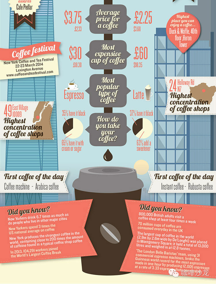 ◎ 以下文章由咖啡沙龍獨(dú)立編輯翻譯,轉(zhuǎn)載請(qǐng)注明出處△ 鳴謝文章推薦者:廣州咖啡博覽會(huì)☆ 投稿請(qǐng)發(fā):tips@coffeesalon.com在紐約,每天喝咖啡的人占市總?cè)丝诘?3%,而倫敦每天喝咖啡的人數(shù)百分比更大,占市總?cè)丝诘?0%。紐約每天每人平均喝掉3.4杯咖啡,倫敦每人每天喝2.3杯;紐約每人每個(gè)工作日平均花費(fèi)5美元喝咖啡,倫敦平均花費(fèi)4.88美元,他們花費(fèi)在每一杯咖啡上的平均價(jià)格相仿,紐約是3.75美元,倫敦是3.68美元;紐約咖啡館的數(shù)量有1770家,而倫敦有1660家。談到咖啡的種類,紐約人最喜歡espresso,但倫敦人更加偏愛(ài)奶味濃點(diǎn)的Latte。在紐約,有35%的人喜歡喝黑咖啡,剩下的65%喜歡加奶跟糖;在倫敦,37%的人喜歡喝黑咖啡,63%的人喜歡加甜味劑。