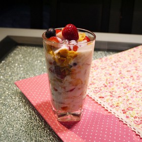 這款甜品的制作真的很簡單,只需將酸奶先放入甜品杯中,然后再將酸奶加入,加蓋后配上小勺,即可售賣。