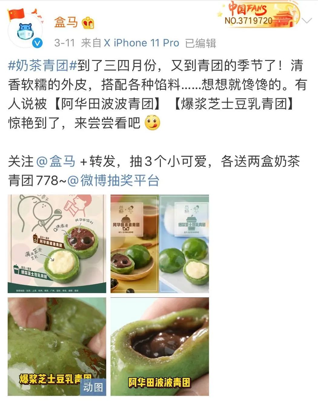 第二天,微博#奶茶青團#登上熱搜,盒馬官宣布與喜茶聯(lián)合推出聯(lián)名款青團產(chǎn)品,且開啟預(yù)售,一小時后青團顯示已售罄。