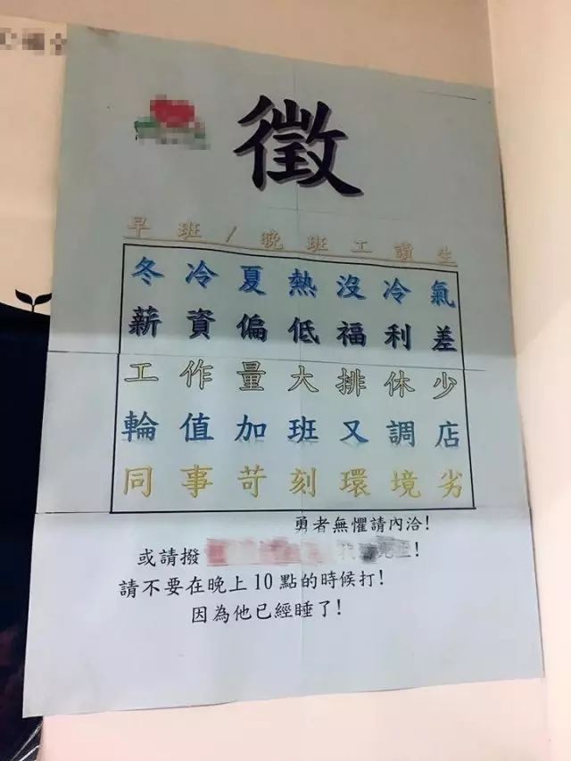 這張招聘啟示是這樣寫的冬冷夏熱沒冷氣薪資偏低福利差工作量大排休少輪值加班又調(diào)店同事苛刻環(huán)境劣