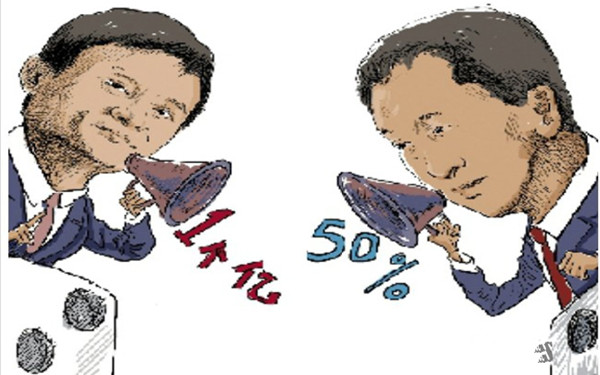 在2012年的中國經(jīng)濟年度人物評選的頒獎晚會現(xiàn)場,阿里巴巴董事局主席方和中國商業(yè)地產(chǎn)大佬王健林,對未來下了一個億元賭局。雙方約定,2020年如果電商在中國零售市場份額占50%,王健林給馬云一個億,如果沒有達到,馬云還王健林一個億。