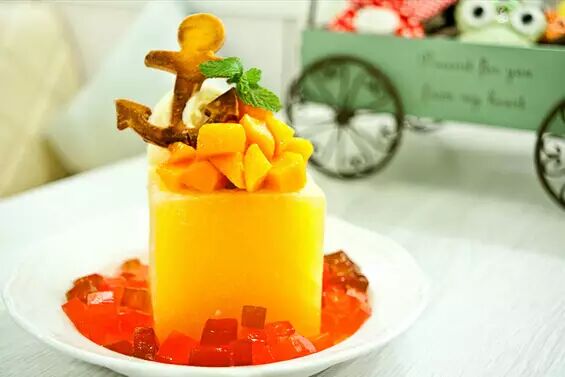 “冰果甜心”以臺灣農(nóng)產(chǎn)品為主軸,選用新鮮芒果、荔枝、鳳梨、覆盆莓,獨(dú)家研發(fā)10的3次方造型水果冰磚,冰磚內(nèi)中空愛心造型,內(nèi)藏手工水果冰淇淋,并搭配各式特制水果配料以及手工造型餅干等,享用過程中,將發(fā)現(xiàn)“層層的驚喜”!