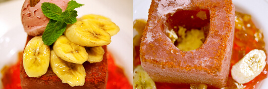 覆盆子口味的冰磚,擺上自制冰淇淋茶凍,還有帶有焦糖風(fēng)味的切片香蕉,果香、酸味的冰塊方磚, 口感豐富。