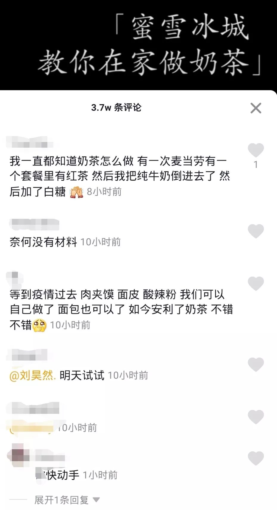 連續(xù)3天,茶飲品牌蜜雪冰城在推出“線上教學”,由公司人員選用家庭中容易采購或現(xiàn)成的原料制作飲品,并錄制視頻用于對粉絲的“培訓”。